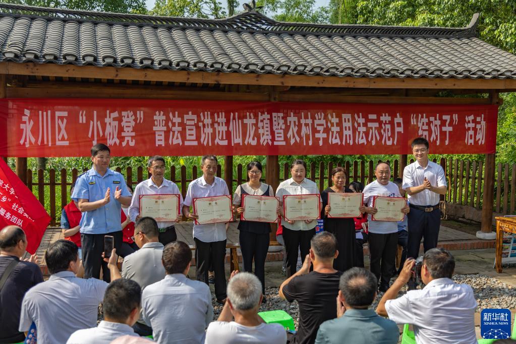7月10日,在重慶市永川區仙龍鎮雙星村,工作人員為村內學(xué)法用法示范戶(hù)頒發(fā)“小板凳”宣講隊隊員聘書(shū)。