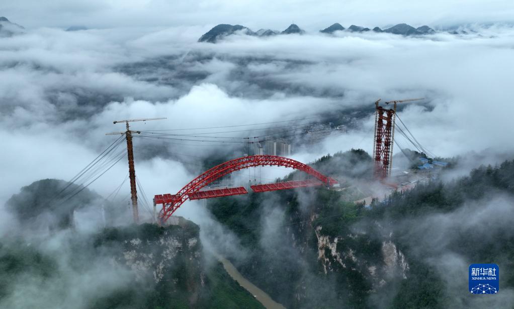 這是7月10日拍攝的建設中的溇水河特大橋(無(wú)人機照片)。