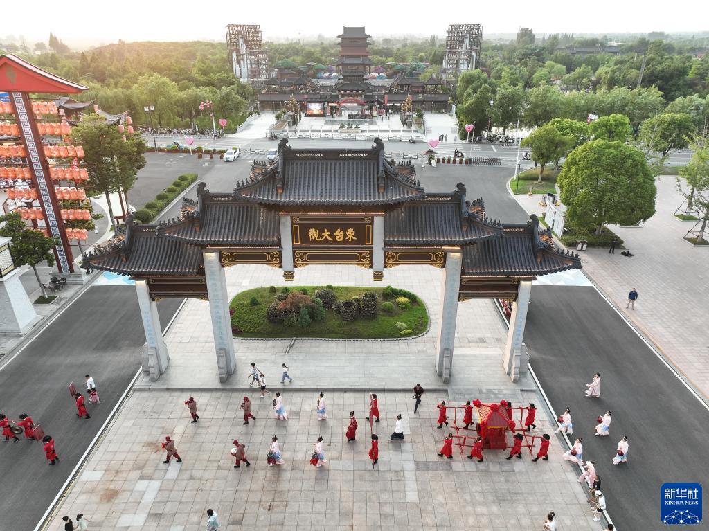 7月9日在江蘇東臺西溪天仙緣景區拍攝的民俗婚禮表演(無(wú)人機照片)。