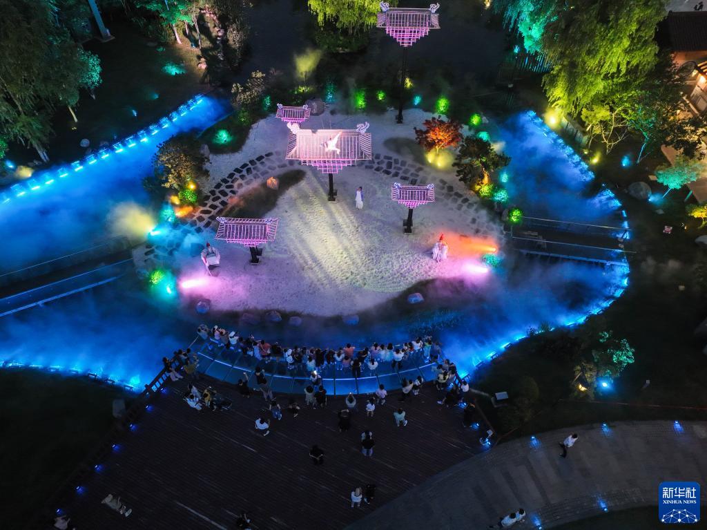 7月9日,在江蘇東臺西溪天仙緣景區,觀(guān)眾在觀(guān)看行進(jìn)式夜間游園演出《尋仙緣》(無(wú)人機照片)。