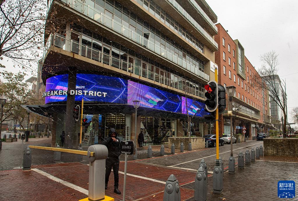 7月10日,在南非約翰內斯堡一處商業(yè)區,人們在雪中行走。