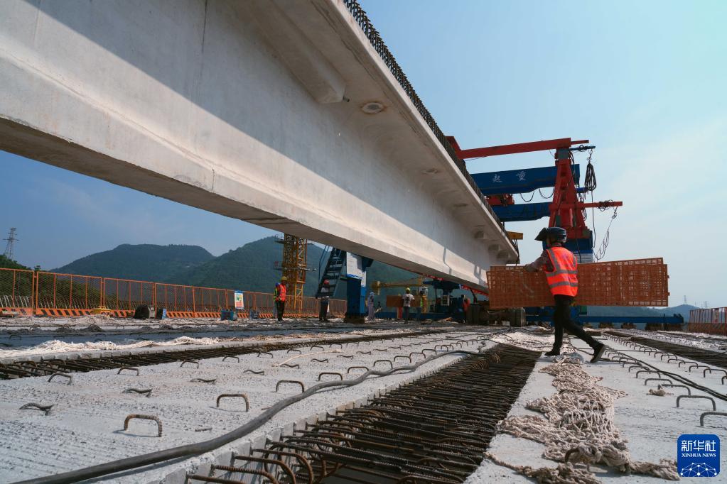 7月10日,施工人員在重慶市北碚區渝武高速復線(xiàn)觀(guān)音峽嘉陵江特大橋架設引橋T梁。