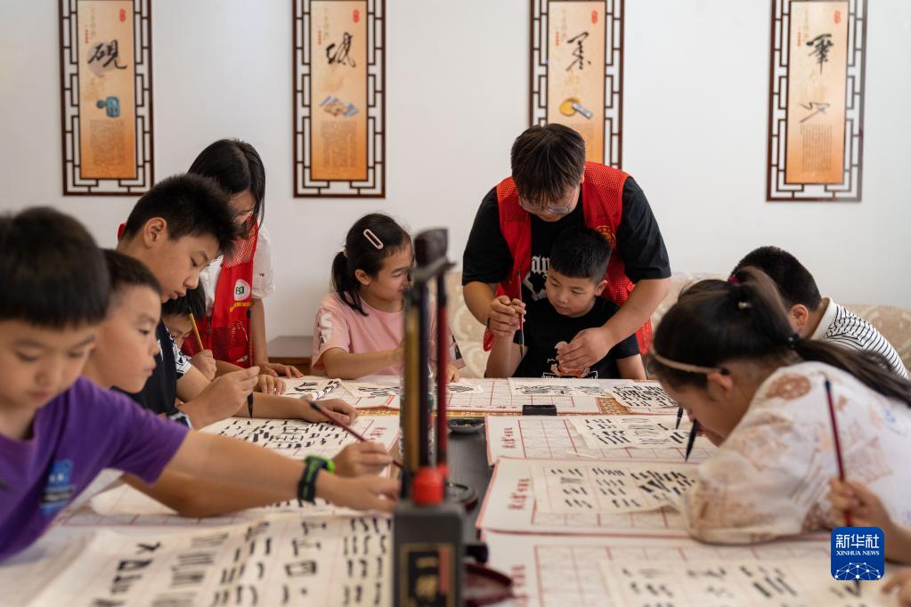 7月10日,在安徽省合肥市肥東縣店埠鎮新城社區暑托班上,志愿者在給孩子們上書(shū)法課。
