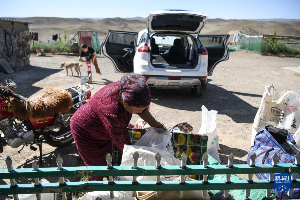 巴哈提和小女兒昆樹(shù)阿克整理家中轉場(chǎng)所需的物品,并準備打包裝車(chē)(7月3日攝)。第一天的路相對平坦,汽車(chē)可以把物資運到山腳。