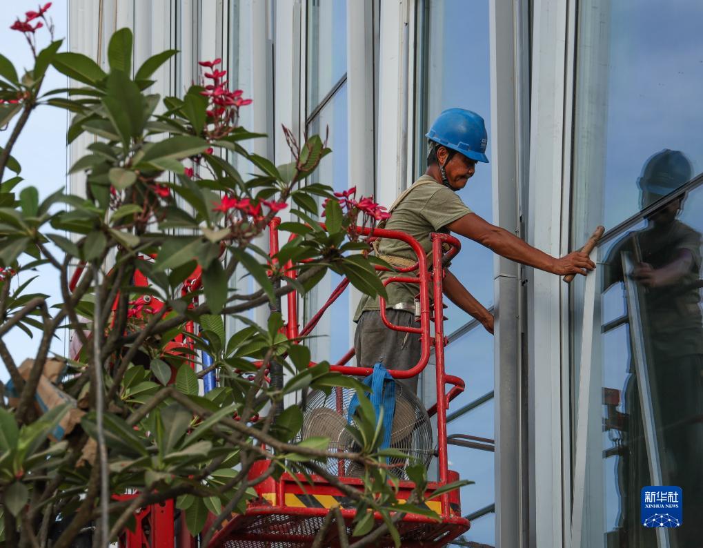 建設者在國際金融論壇(IFF)永久會(huì )址進(jìn)行幕墻施工(7月10日攝)。