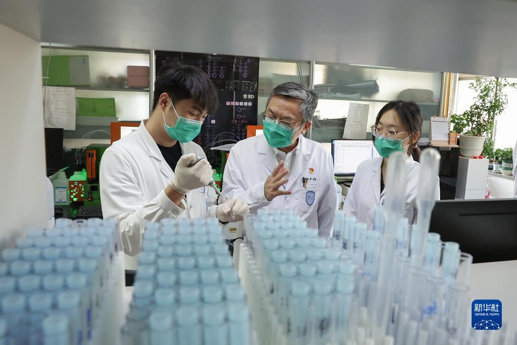 6月30日,黃曉軍(中)在北京大學(xué)血液病研究所指導學(xué)生做實(shí)驗。