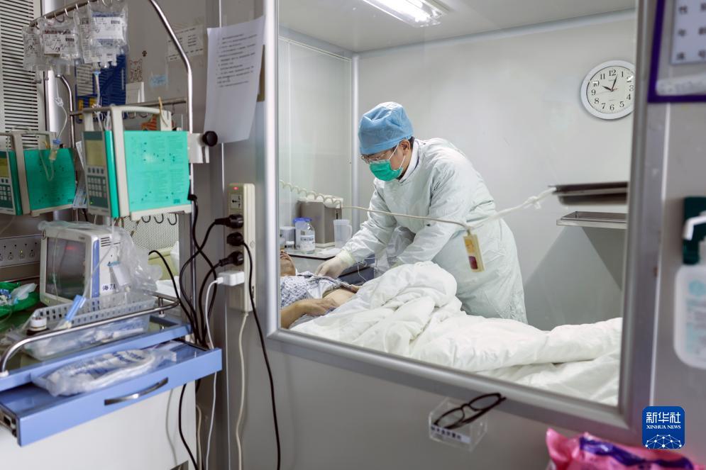 6月30日,黃曉軍在北京大學(xué)人民醫院血液科骨髓移植倉里查房。