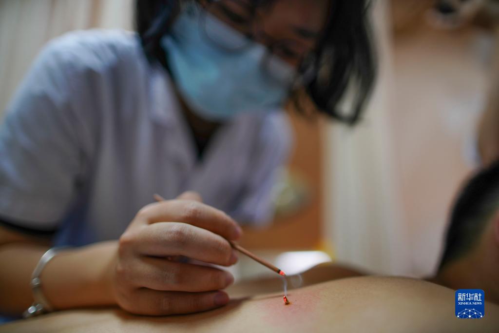 7月11日,在浙江省溫州市中心醫院,醫護人員在為市民進(jìn)行“麥粒灸”。