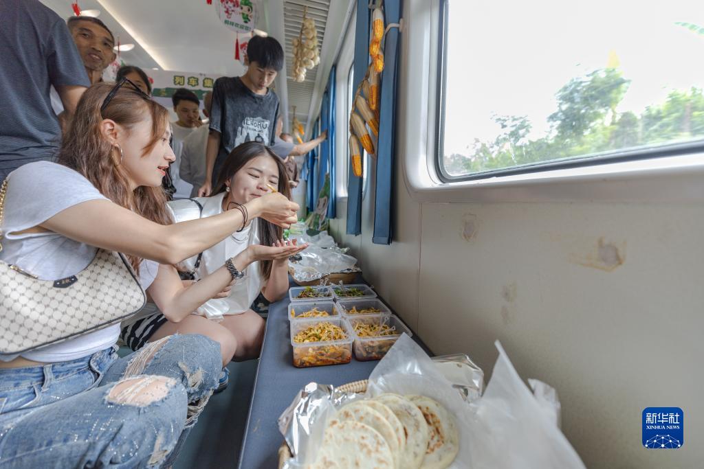 7月11日,旅客在5630次列車(chē)上的“列車(chē)集市”品嘗特色美食。