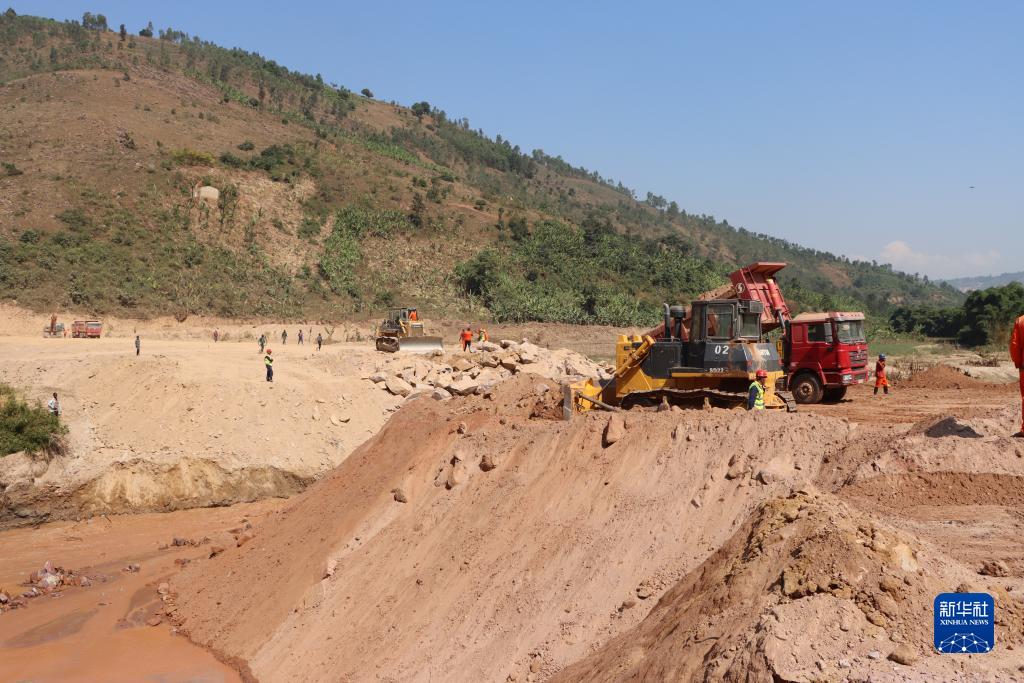 這是7月10日在盧旺達北方省加肯凱市拍攝的中企承建盧旺達那巴龍格河二號水電站項目截流現場(chǎng)。