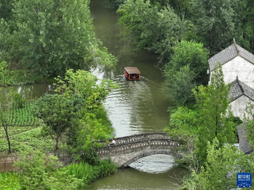 7月11日,游人乘船游覽穆溝古村(無(wú)人機照片)。