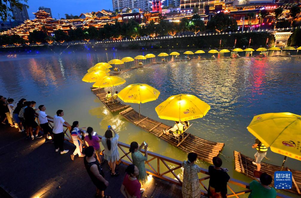 7月10日晚,在宣恩縣城貢水河畔上,游客乘坐竹筏賞夜景。