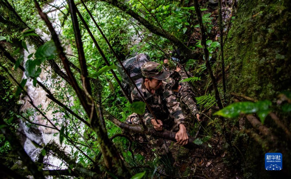 7月8日,在高黎貢山國家自然保護區,巡護隊員抓著(zhù)樹(shù)根順著(zhù)接近90度的懸崖慢慢滑下。新華社記者 江文耀 攝