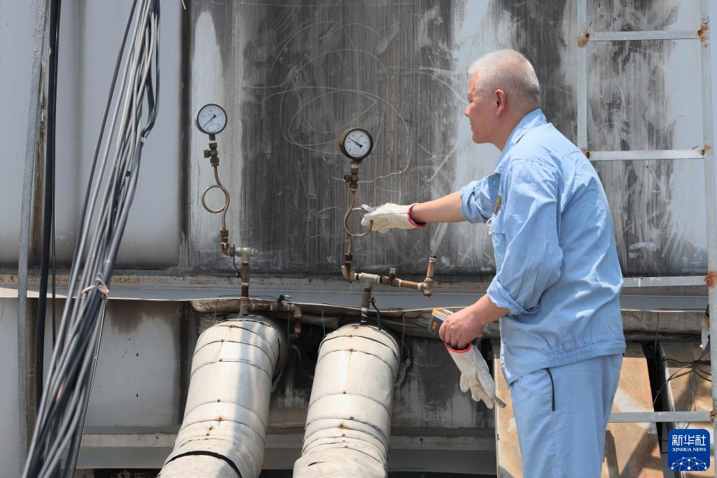 7月11日,鐵路上海站綜合車(chē)間司爐工康鳴查看鍋爐供水管道上的壓力表是否正常。