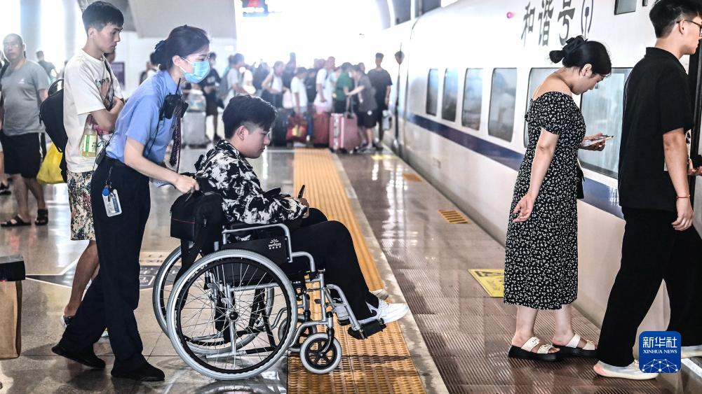 在南寧東站,客運員唐瑩在護送一名行動(dòng)不便的重點(diǎn)旅客乘車(chē)(7月11日攝)。