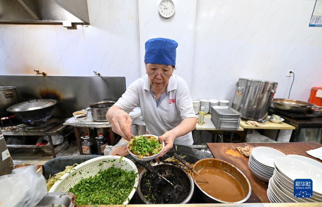 7月11日,在天津西北角一家早點(diǎn)鋪,商家在調配鍋巴菜配料。