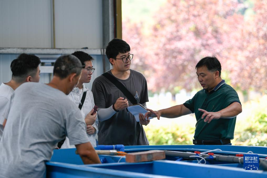 2023年6月27日,在宜賓珍稀水生動(dòng)物研究所與四川省農科院水產(chǎn)研究所合作的繁育基地,周亮(右一)與到訪(fǎng)的三峽大學(xué)水利與環(huán)境學(xué)院的學(xué)生們交流養殖經(jīng)驗。新華社記者 胥冰潔 攝