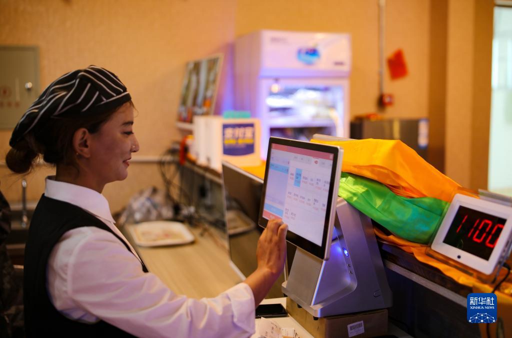 多爾格村村民尼達卓瑪在合作社開(kāi)辦的茶館前臺收銀(7月11日攝)。