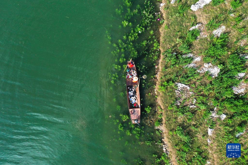 7月10日,盧錫永、冉茂英夫婦駕駛小船在烏江上打撈漂浮物(無(wú)人機照片)。