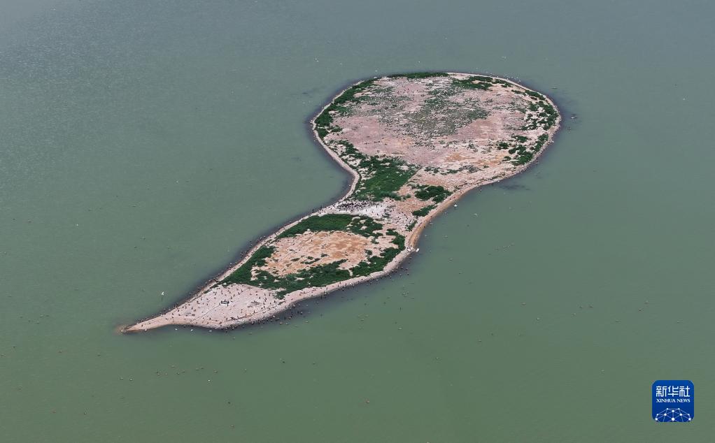7月11日,大批候鳥(niǎo)在康巴諾爾國家濕地公園湖心島覓食(無(wú)人機照片)。