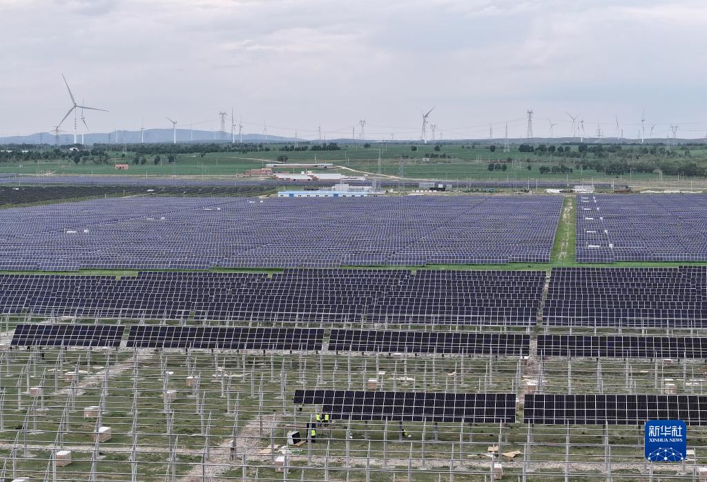 這是張家口市康??h張紀鎮一處施工中的光伏發(fā)電場(chǎng)(7月11日攝,無(wú)人機照片)。