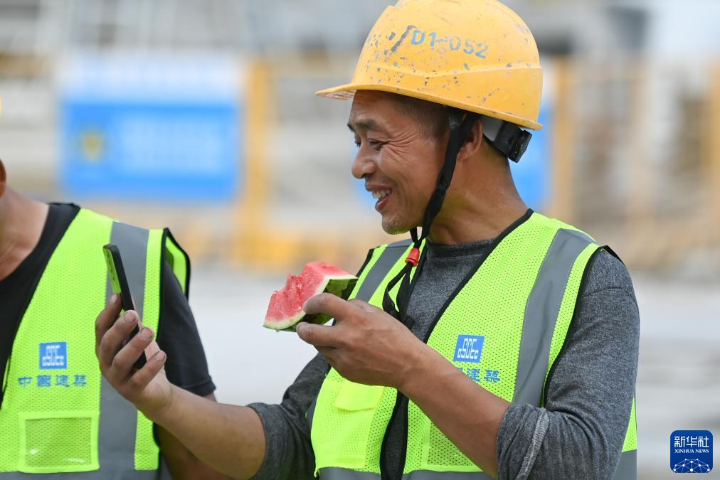 7月12日,中建四局浙江中醫藥大學(xué)附屬第二醫院中醫藥傳承創(chuàng )新基地項目部的一名工人在休息站吃西瓜時(shí)與家人視頻聊天。