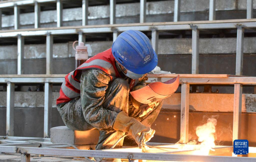 7月13日,工人在北京城市副中心圖書(shū)館項目施工現場(chǎng)施工。