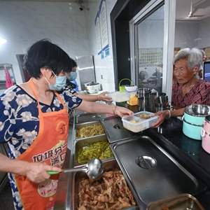 7月13日,老人們在湍口鎮迎豐村老年食堂打飯。這個(gè)老年食堂的建設得益于新鄉賢們的捐贈相助。