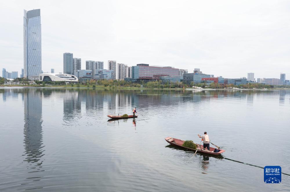在四川天府新區興隆湖,工作人員賴(lài)小利(左)在撈水草(2022年9月21日攝)。新華社記者 江宏景攝