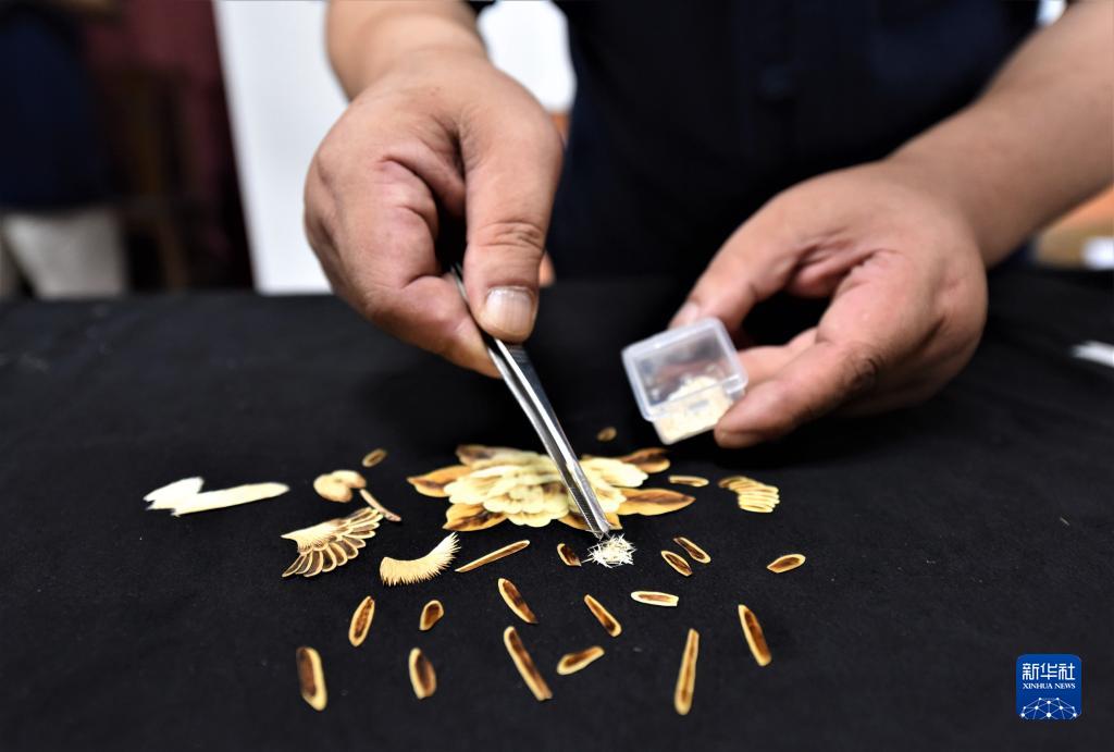 7月12日,吳永龍將麥稈畫(huà)“零件”擺放在桌面上。新華社記者 黃曉勇 攝