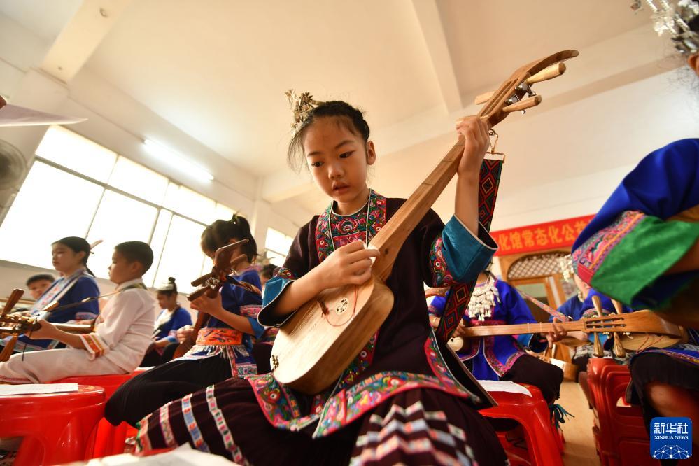 7月13日,在廣西三江侗族自治縣文化館,小學(xué)生在學(xué)習彈唱侗族琵琶歌。