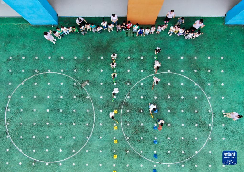 7月13日,在安徽省合肥市肥西縣山南鎮中心幼兒園,孩子們在玩滾鐵環(huán)游戲(無(wú)人機照片)。