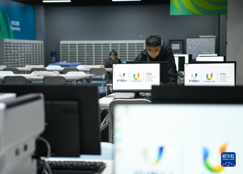 7月13日,在成都大運會(huì )主媒體中心,工作人員正在調試媒體工作間的電腦。