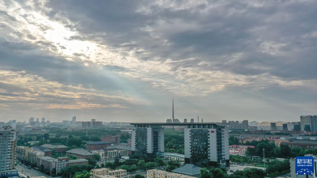 7月13日無(wú)人機拍攝的晨曦中的一汽解放總部大樓。