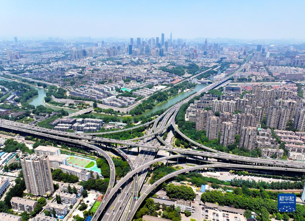 南京雙橋門(mén)立交樞紐與明城墻、城市景色(無(wú)人機照片,6月9日攝)。