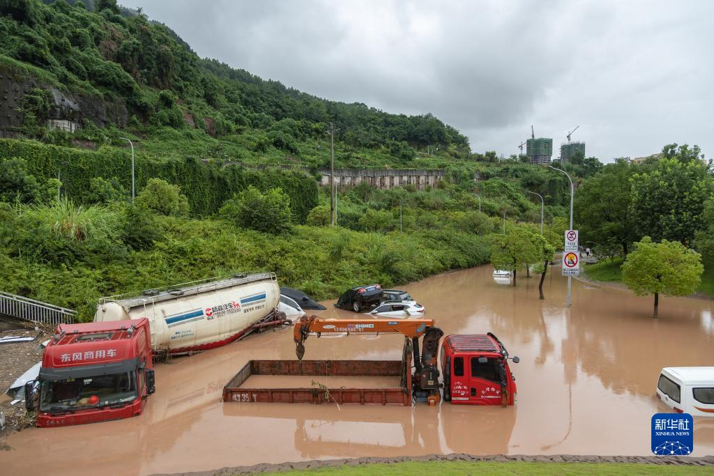 7月14日,在重慶市萬(wàn)州區江南新區,??吭诼愤叺牟糠周?chē)輛陷在洪水淤泥里。