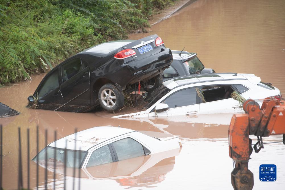 7月14日,在重慶市萬(wàn)州區江南新區,??吭诼愤叺牟糠周?chē)輛陷在洪水淤泥里。