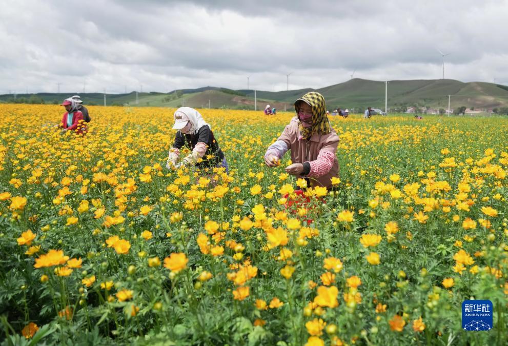 7月14日,河北省沽源縣長(cháng)梁鄉興隆堡村金蓮花種植合作社的社員在田間采摘金蓮花。