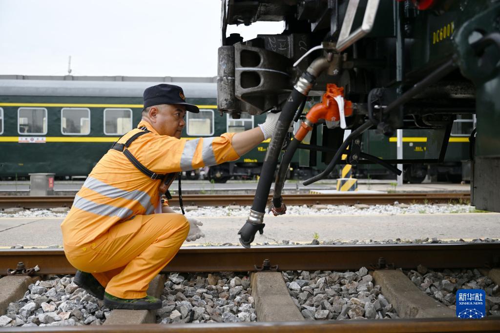 7月13日,合肥火車(chē)站運轉車(chē)間調車(chē)長(cháng)李健在調試車(chē)輛制動(dòng)軟管。