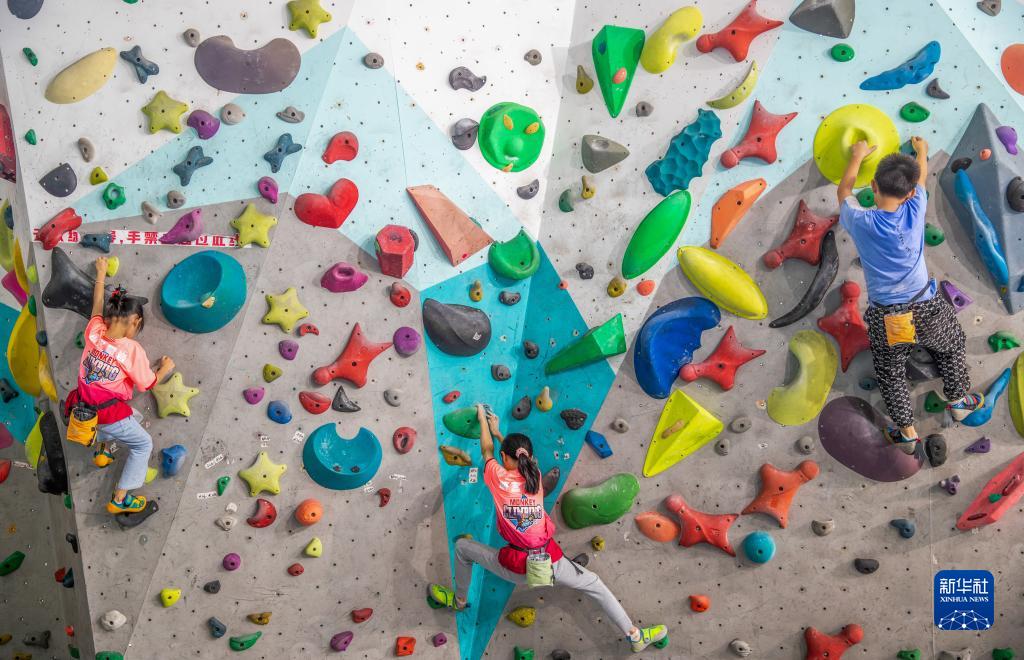7月14日,孩子們在重慶市南川區一家攀巖訓練館里練習攀巖。