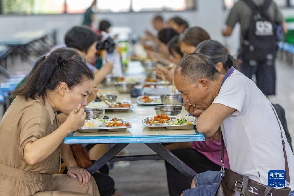 7月14日,在重慶市萬(wàn)州三中江南校區臨時(shí)安置點(diǎn)內,轉移安置人員在就餐。