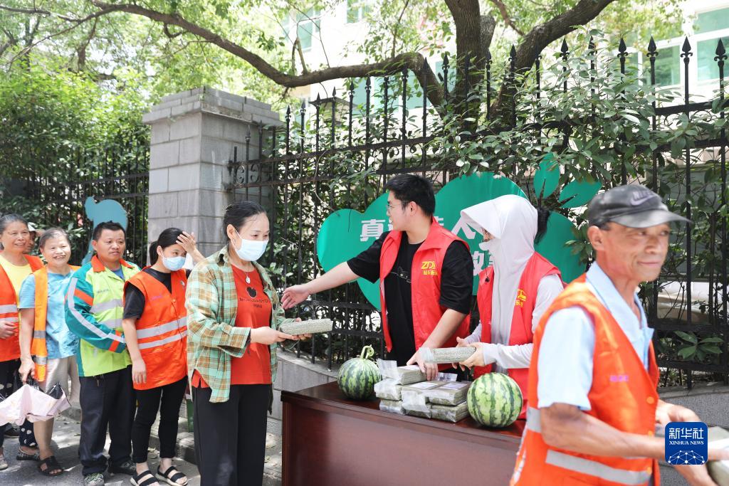 在江西南昌青山湖區站東街道,環(huán)衛工人領(lǐng)取防暑降溫物品(7月14日攝)。