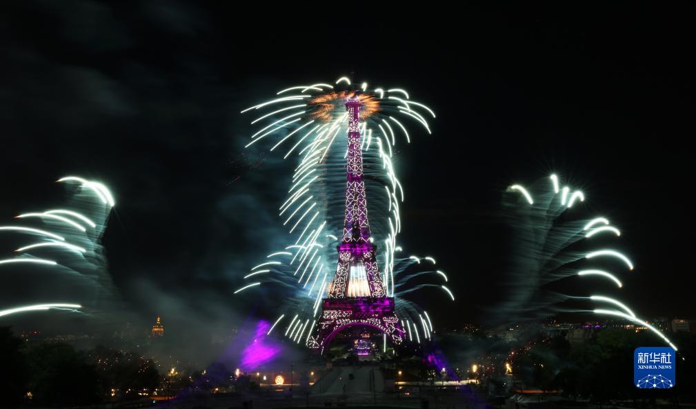 7月14日,焰火在法國巴黎埃菲爾鐵塔周?chē)`放。