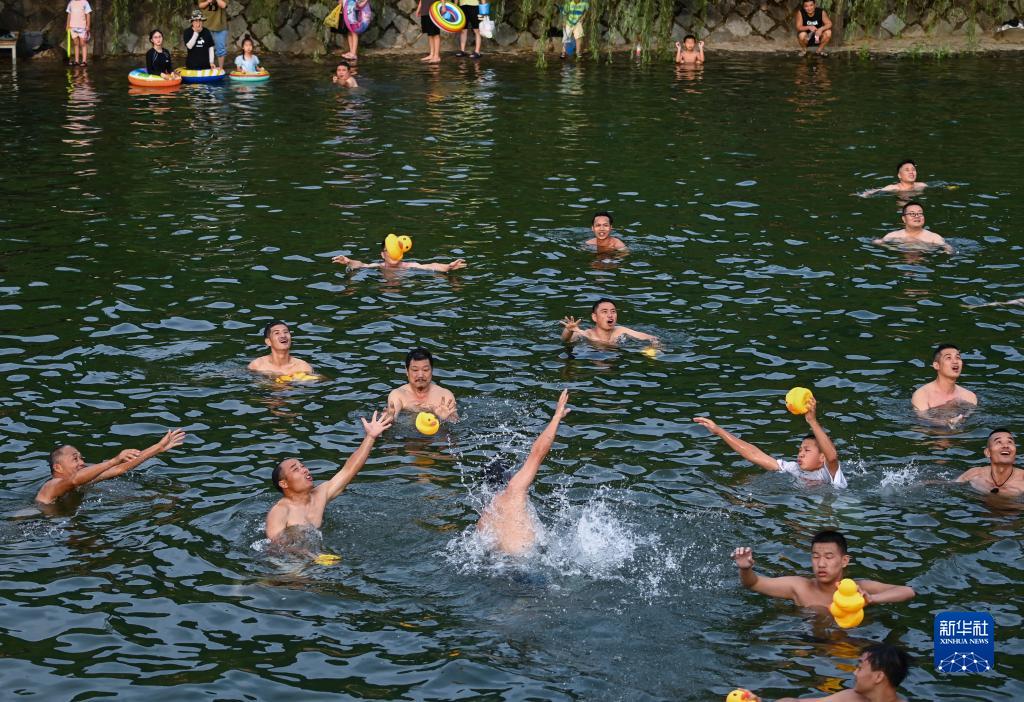 7月14日,游客和村民在乾潭鎮下包村胥溪天然泳場(chǎng)戲水,感受夏日清涼。