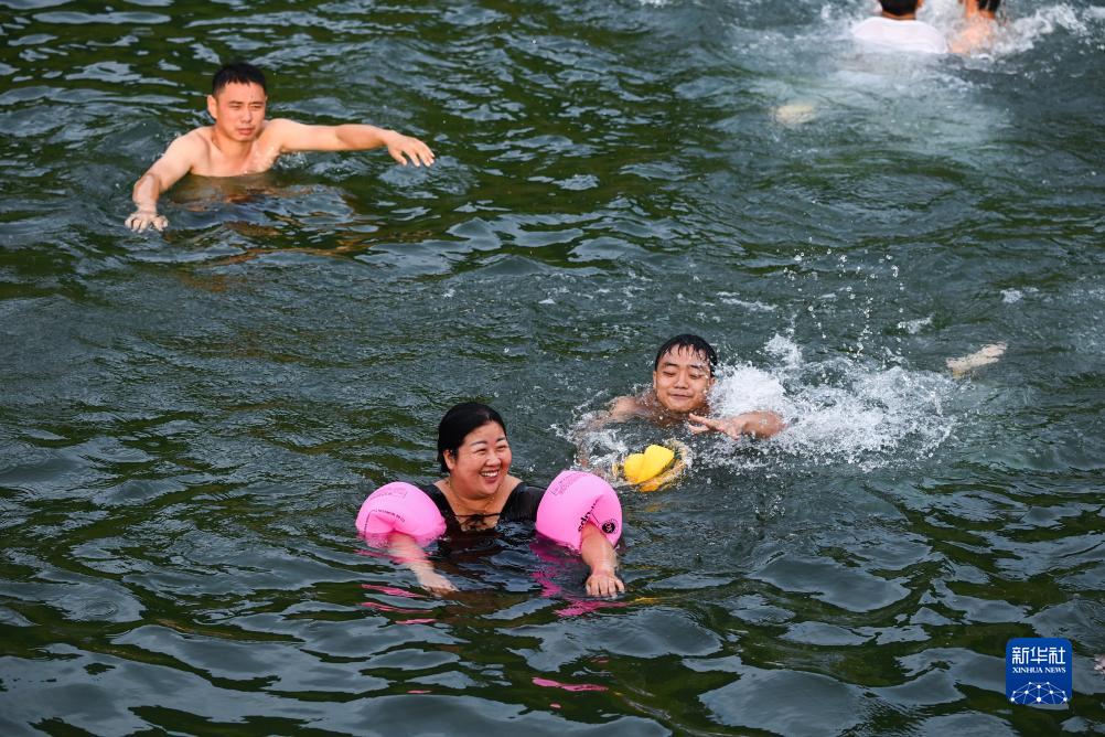 7月14日,游客和村民在乾潭鎮下包村胥溪天然泳場(chǎng)戲水,感受夏日清涼。