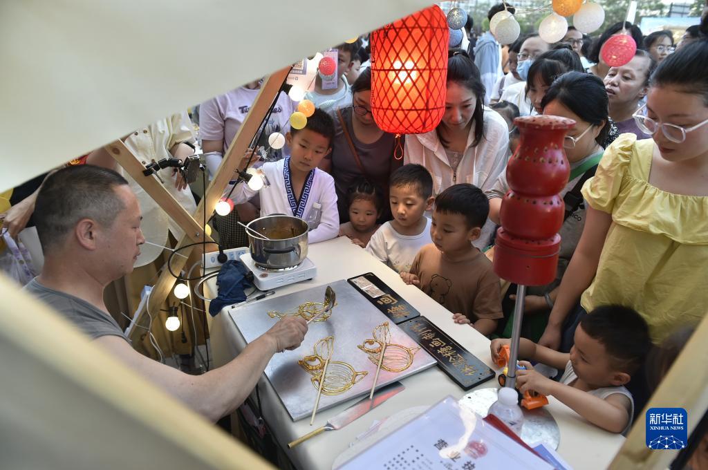 7月14日傍晚,工作人員在開(kāi)封市開(kāi)元廣場(chǎng)設立的“非遺市集”現場(chǎng)展示糖畫(huà)制作技藝。