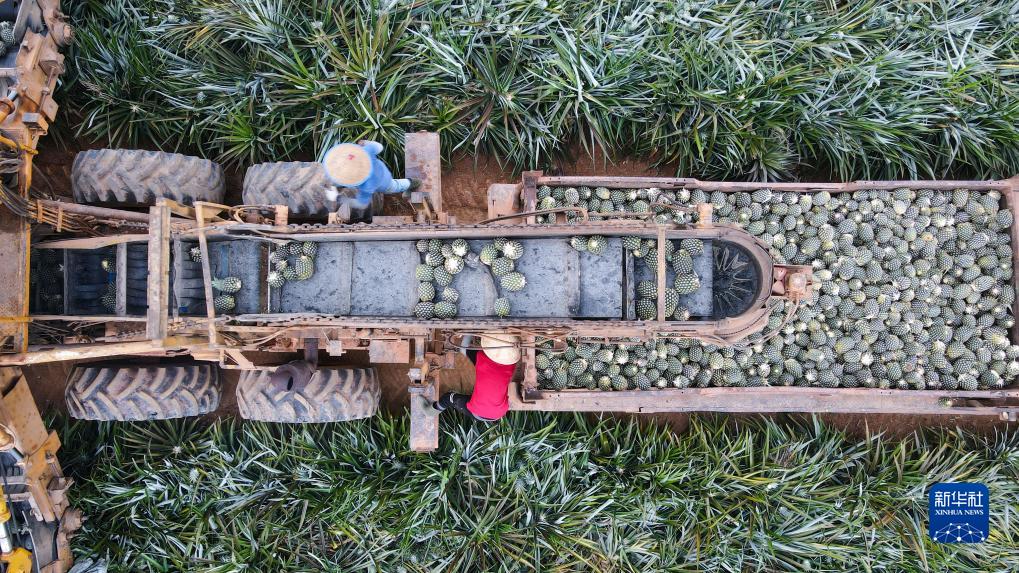 7月5日,在印度尼西亞楠榜省印尼巨大菠蘿有限責任公司菠蘿種植園,人們將采摘下來(lái)的菠蘿裝車(chē)(無(wú)人機照片)。