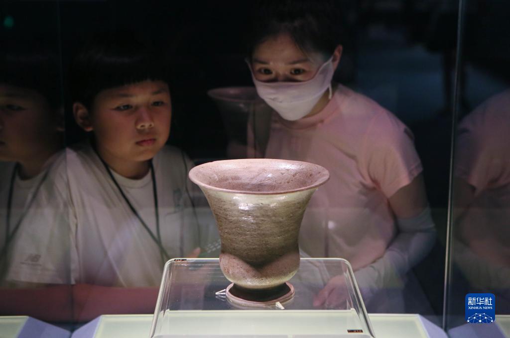 7月14日晚,參觀(guān)者在上海博物館的中國古代陶瓷館觀(guān)看青釉弦紋尊。