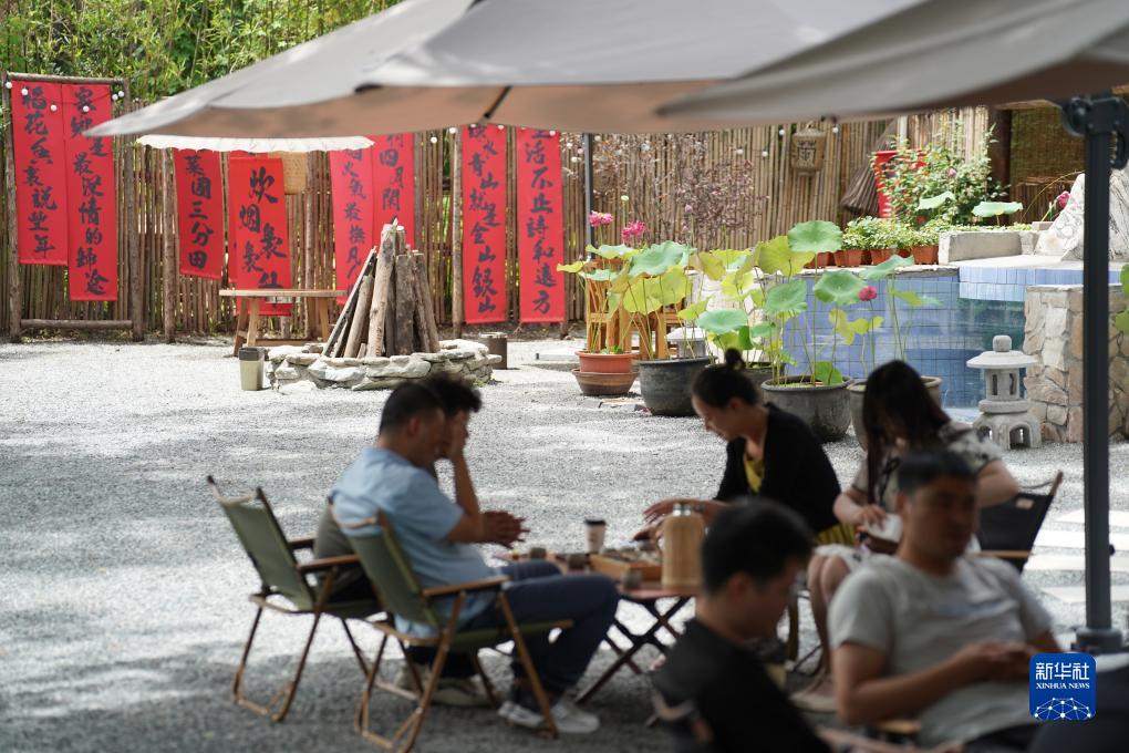 7月14日,游人在周至縣駱峪鎮紅旗村的鄉村會(huì )客廳內休閑。