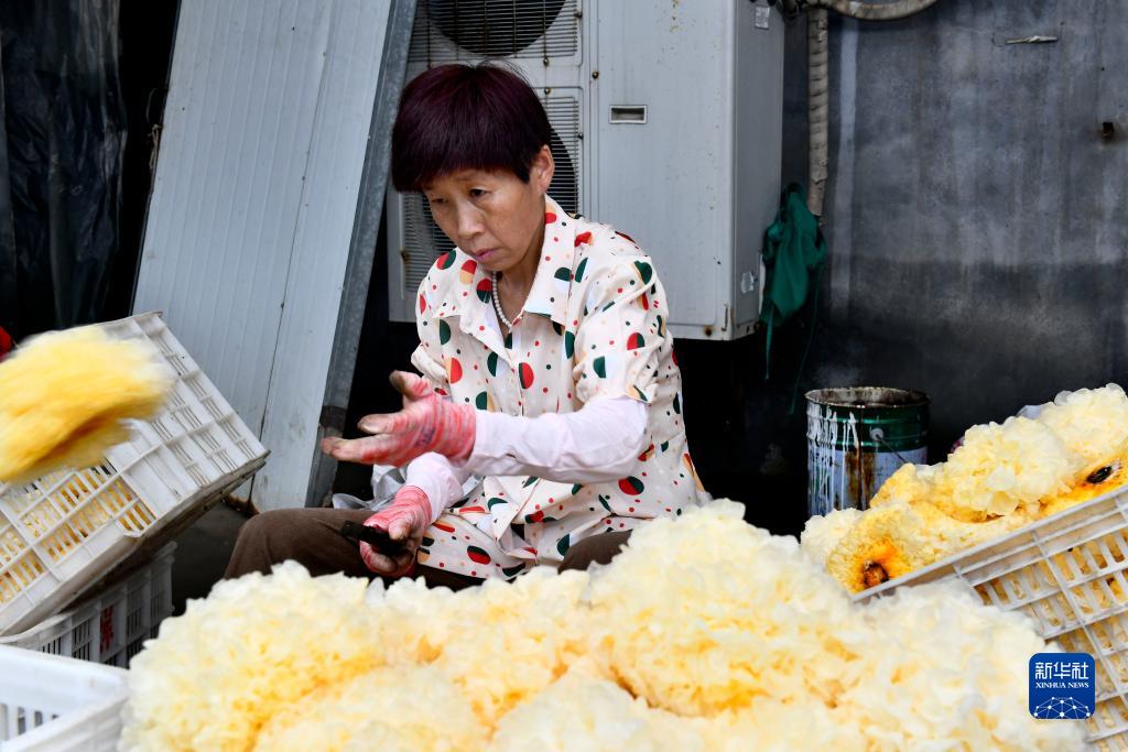 7月15日,在惠民縣胡集鎮銀豐食用菌種植合作社,工作人員在整理新采摘的銀耳。